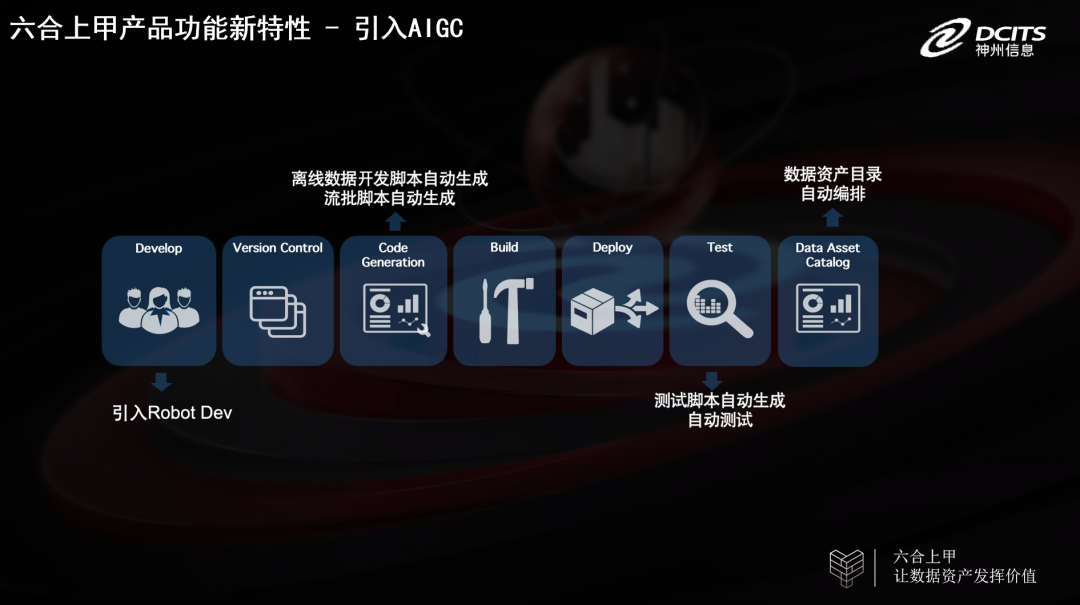 神州信息充分发挥技术领先优势,积极布局AIGC在金融领域的应用,六合上甲平台通过引入Robot Dev、离线数据开发脚本自动生成、流批脚本自动生成、测试脚本自动生成、自动测试和数据资产目录自动编排等先进技术,进一步压缩金融企业数据资产管理成本,提升数据资产开发应用和管理的效率。