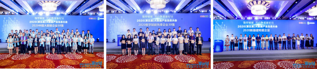 “强基赋能 开启数据新纪元”, 近日,由赛迪传媒、大数据产业生态联盟等主办的“2020(第五届)大数据产业生态大会”北京盛大举行,激起了大数据产业领域的一轮浪潮。会上发布《2020中国大数据产业发展白皮书》,并揭晓系列榜单,神州信息不负众望,连续四年荣登“中国大数据50强”榜单,同时斩获“数字赋能先锋企业30强”、“新基建明星企业30强”,共三个重磅奖项!